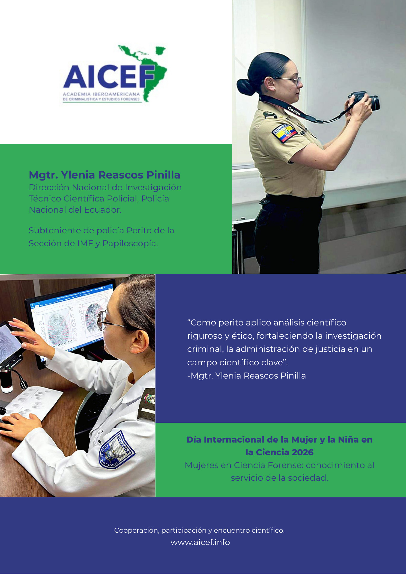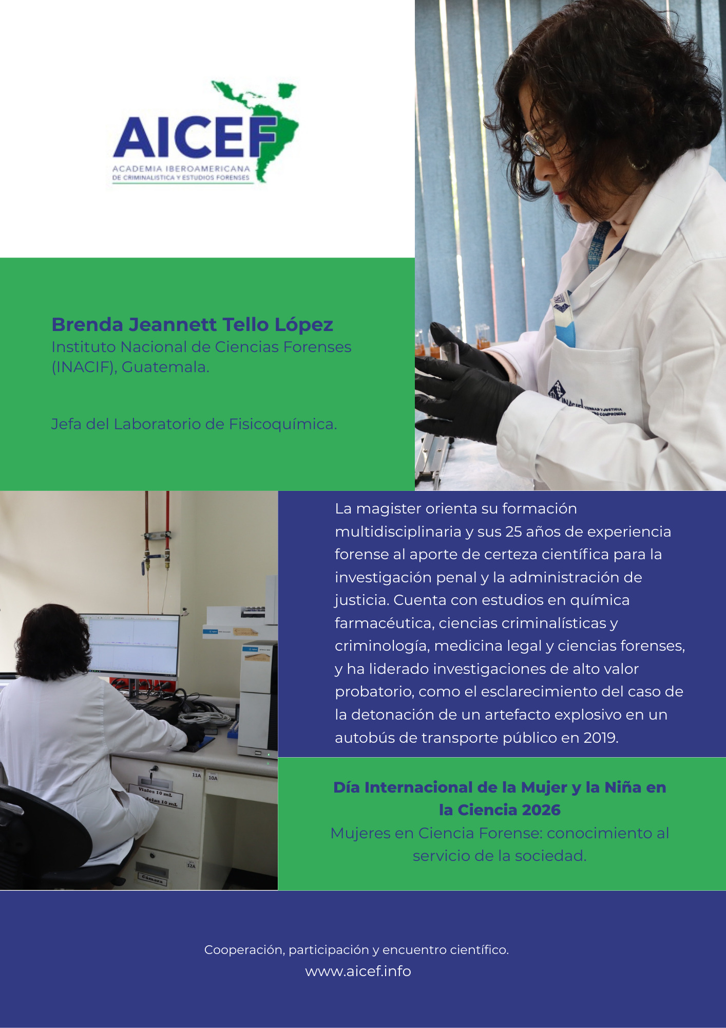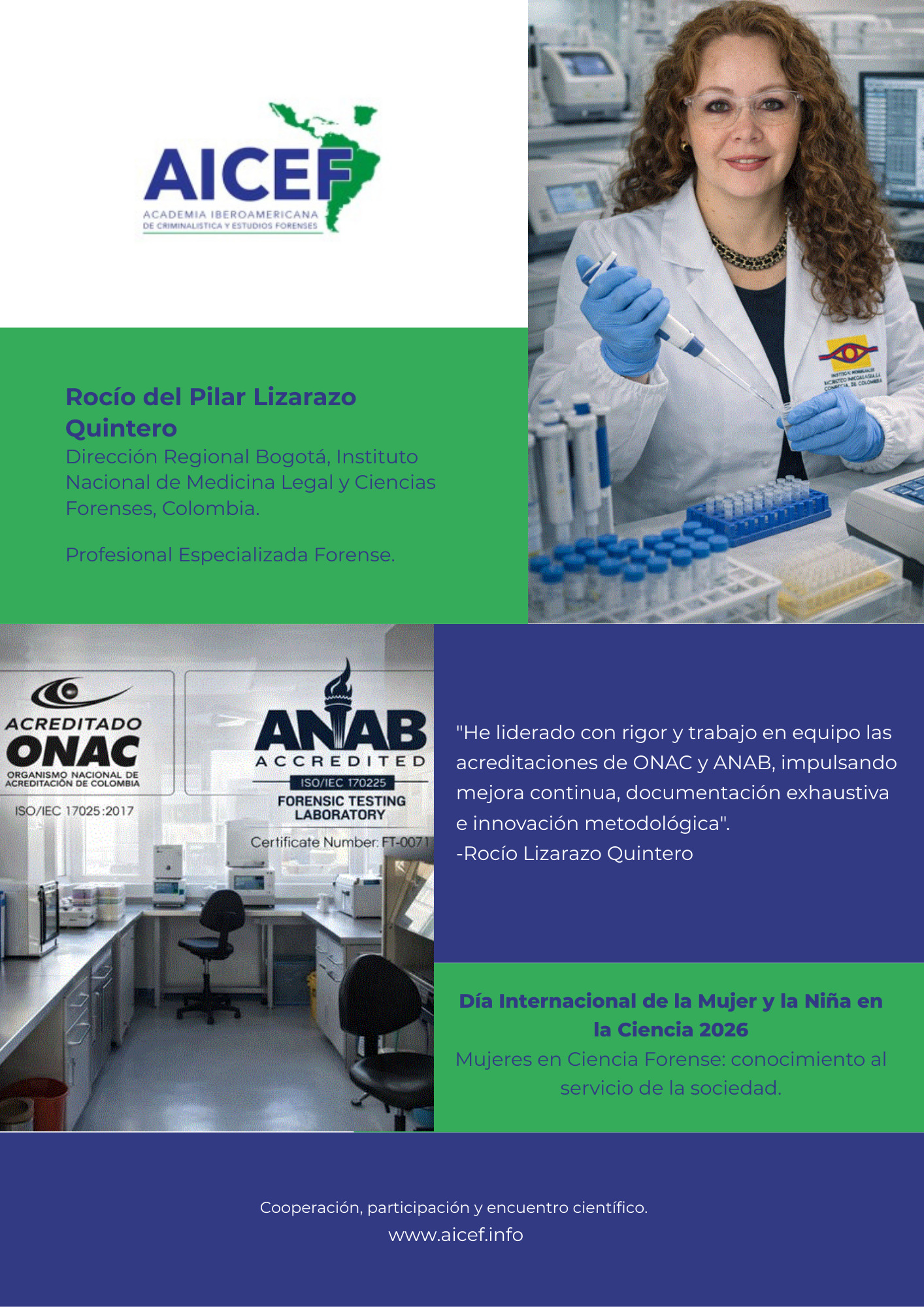 En el marco del Día Internacional de la Mujer y la Niña en la Ciencia, la Academia Iberoamericana de Criminalística y Estudios Forenses presenta esta galería para visibilizar el aporte de mujeres en la ciencia forense al servicio de la sociedad.